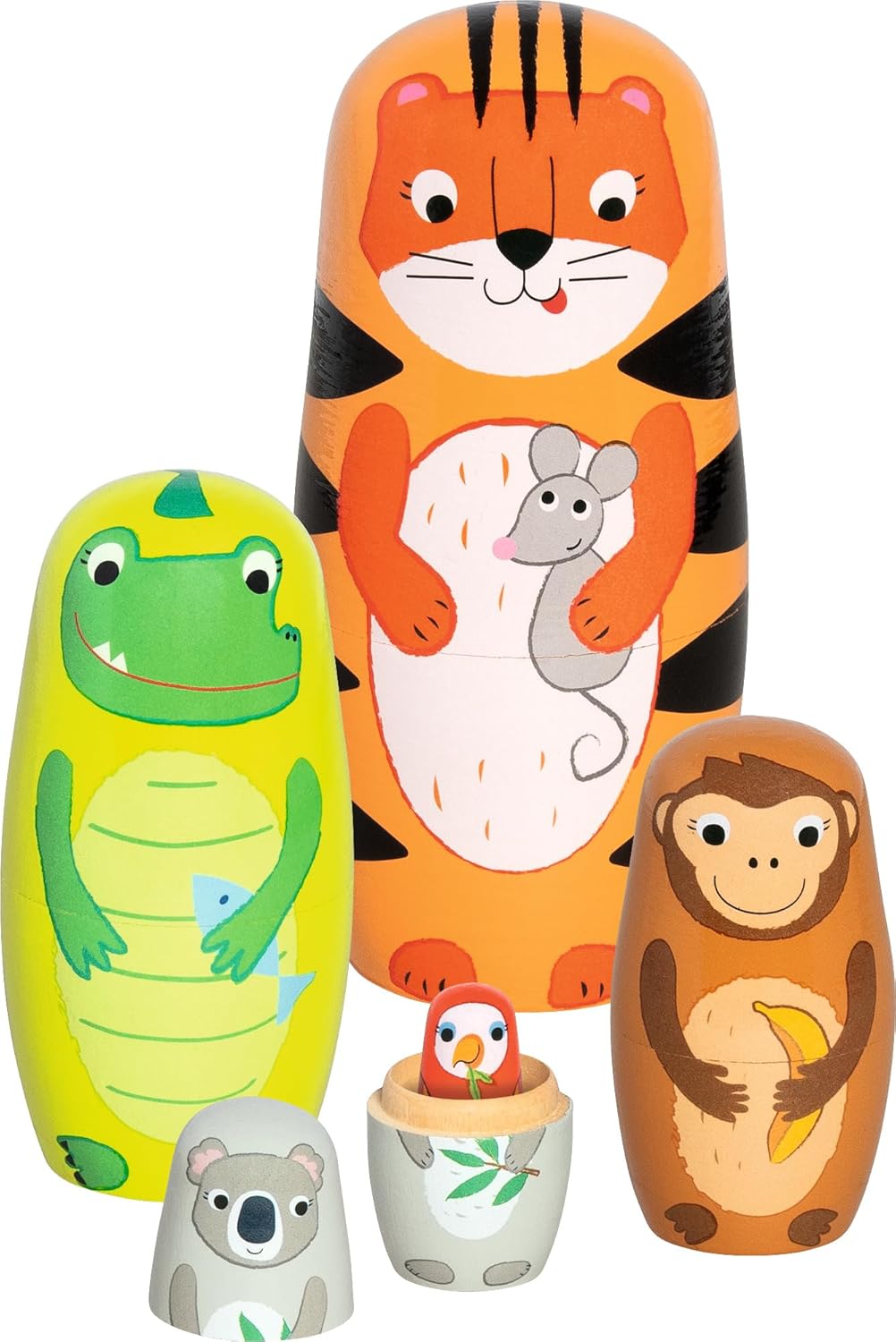 Klassikaline puidust matryoshka loomamotiividega, kus laps asetab nukud üksteise sisse. Aitab mõista suuruste vahekordi ja arendada käelist osavust.